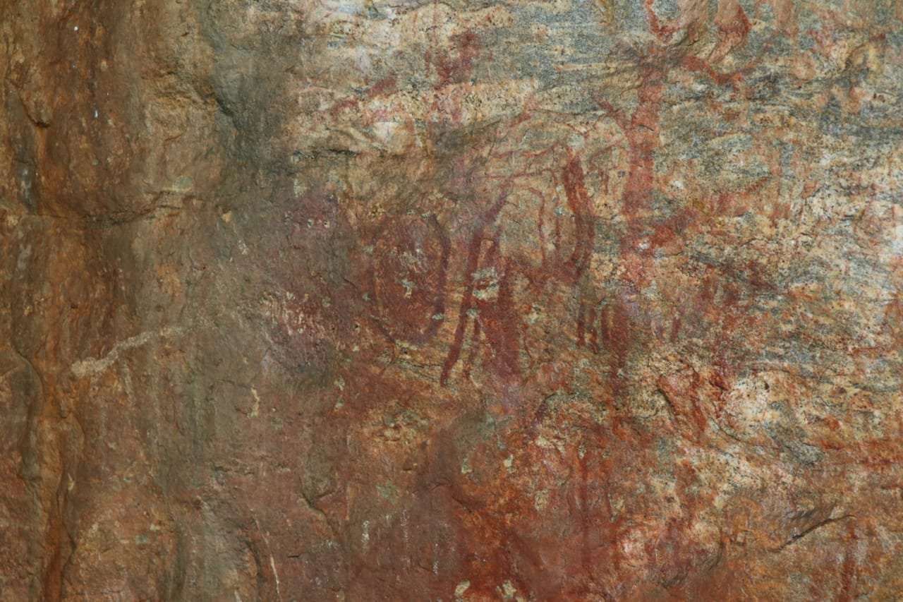 பாறைச்சுவர் முழுக்க சிவப்பு நிற ஓவியங்கள் நேர்த்தியாக வரையப்பட்டிருக்கின்றன. புல்வெளிகள், மரங்கள், விலங்குகள், பறவைகள், மனிதர்கள், மலைமுகடுகளைக் குறிக்கும் கோடுகள், செங்குத்தாக வரையப்பட்ட நீளமான கோடுகள், நீள் வட்ட வடிவில் இரண்டு வட்டங்கள் வட்டத்தின் உள்பகுதிகள் அலை அலையான கோடுகளால் முழுமையாக நிரப்பப்பட்டிருக்கின்றன பார்ப்பதற்கு பலாப்பழம் போன்று காட்சி தருகிறது.