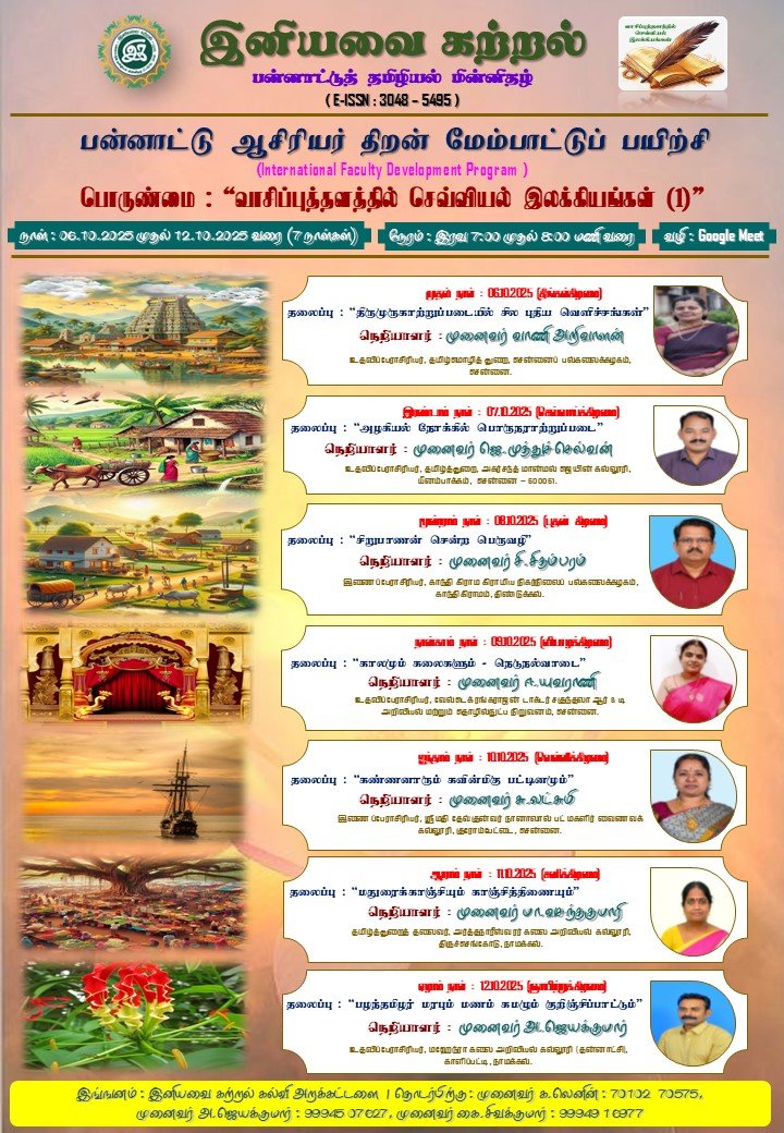 “செவ்வியல் இலக்கியங்கள்” என்ற பெரும் செல்வத்தைப் பலவற்றையும் அறியும் வகையில் ஆசிரியர்களுக்கான திறன் மேம்பாட்டுப் பயிற்சி நிகழ உள்ளது. இந்தச் சிந்தனையூட்டும் நிகழ்வில் பேராசிரியப் பெருமக்கள் அனைவரையும் கலந்து கொள்ள அழைக்கின்றோம்.